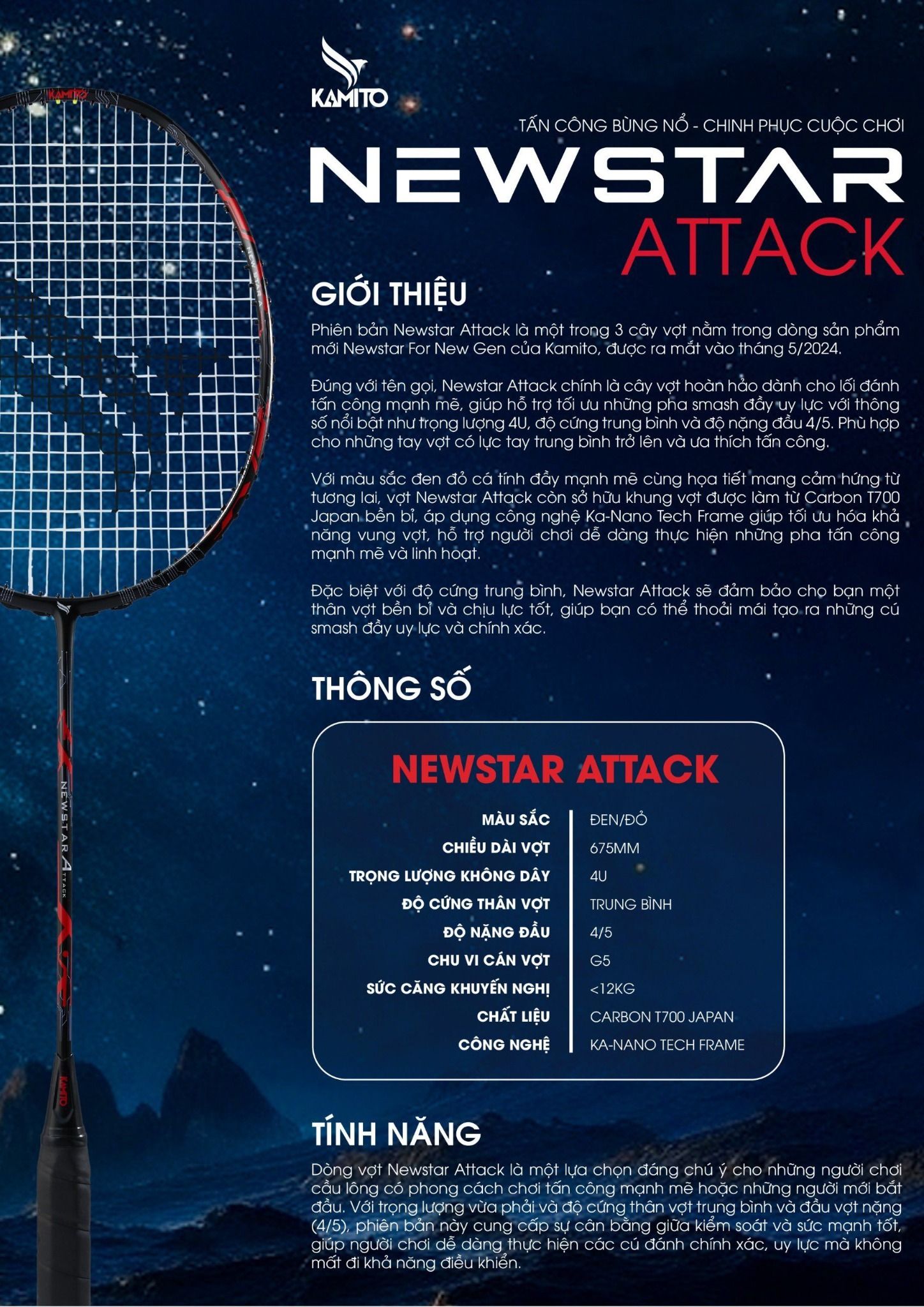 Những công nghệ này biến Kamito Newstar Attack thành cây vợt cầu lông lý tưởng cho lối chơi tấn công với hiệu suất cao và độ bền đáng tin cậy.