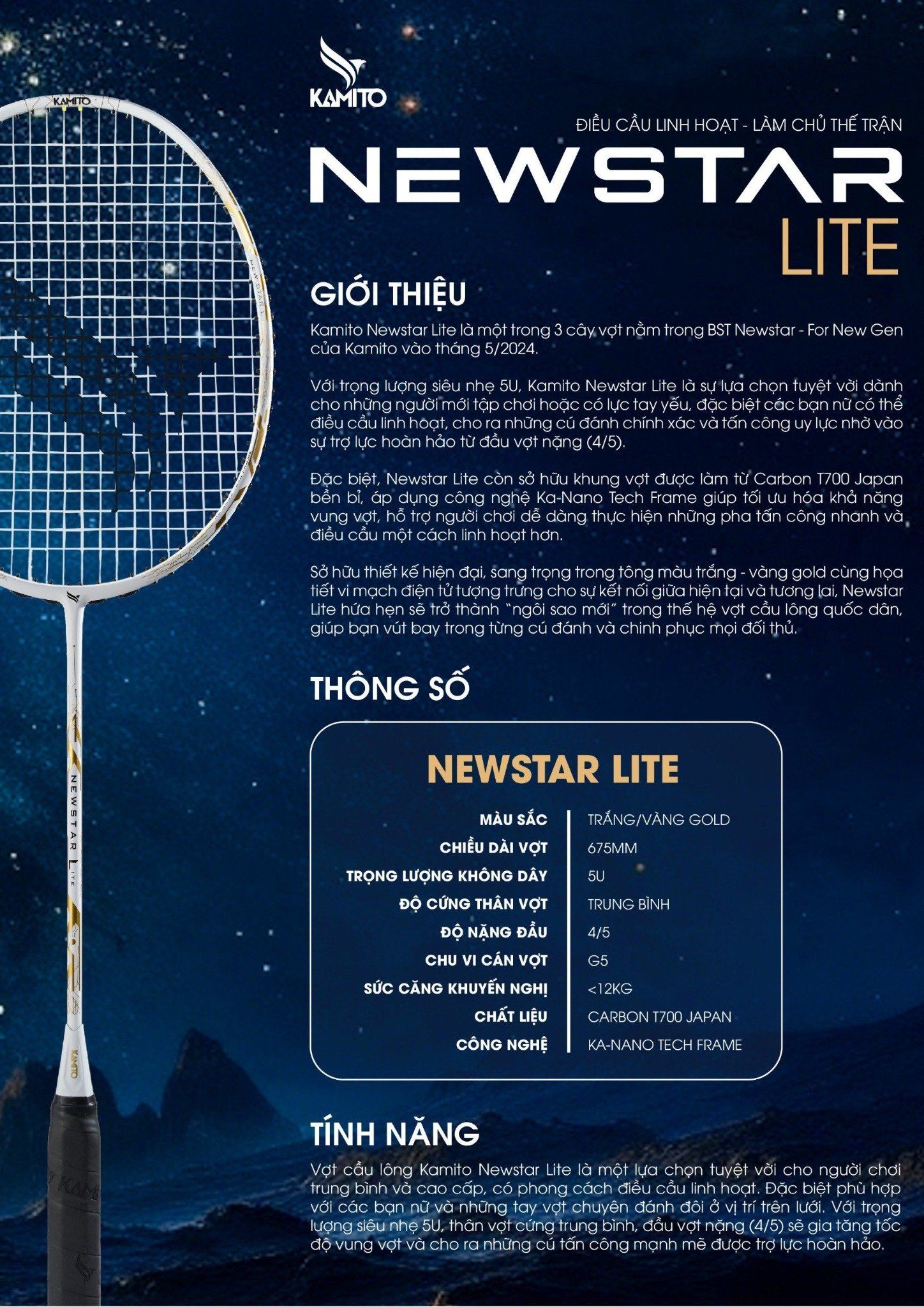 Vợt cầu lông Kamito Newstar Lite là sản phẩm nổi bật thuộc dòng Newstar - For New Gen của thương hiệu Kamito, mang đến sự kết hợp hoàn hảo giữa trọng lượng siêu nhẹ và khả năng điều cầu linh hoạt. Được thiết kế dành riêng cho người mới chơi, các bạn nữ hoặc tay vợt đánh đôi trên lưới, cây vợt cầu lông này là lựa chọn lý tưởng trong phân khúc giá rẻ. Nếu bạn đang tìm kiếm một cây vợt cầu lông chất lượng để nâng tầm trải nghiệm, Kamito Newstar Lite chính là sản phẩm đáng cân nhắc.